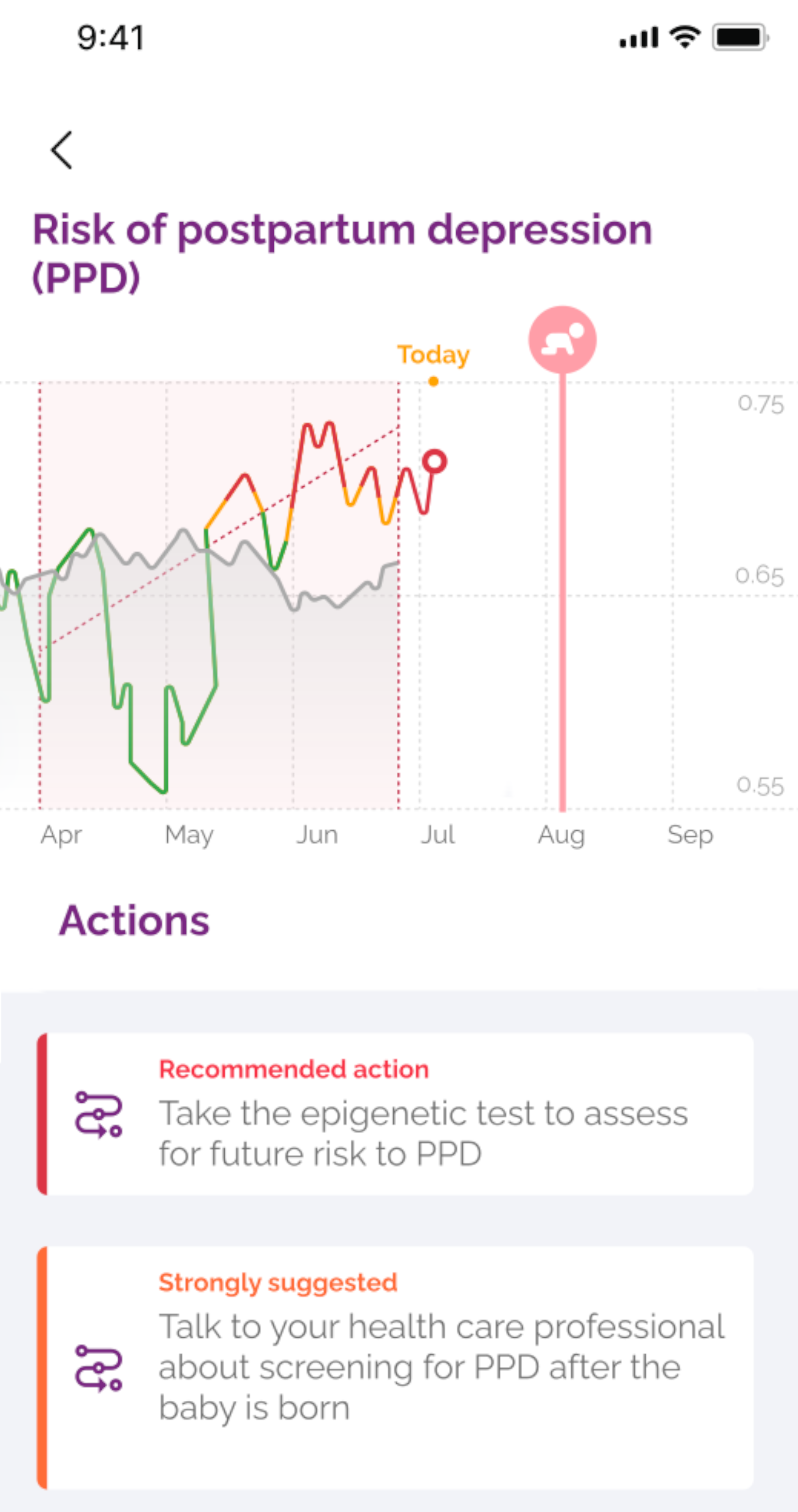 Other fields of health benefit from prognostic tests, allowing doctors and patients to act to reduce future disease risk. Why should mental health be any different? With PPD, knowing the future comes with benefits. A non-invasive private digital interface coupled with our ground breaking AI acts as a first step to help you understand your risk. Anyone can take the PPD blood test. Having a biological test showing you are at elevated risk to PPD will help you and your supporters to recognize symptoms if they develop. You’ll know you are more than ‘just tired’ and that it is time to get screened by your doctor so you can be treated. Having that extra support beforehand may even protect against PPD17,18.